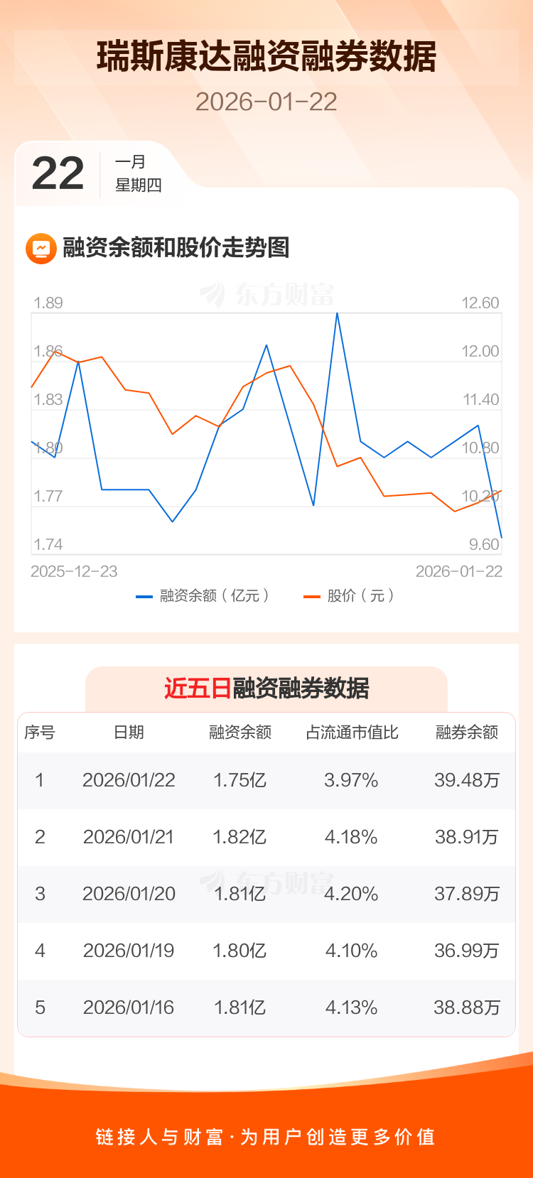 交易所最新数据显示,瑞斯康达于2026年1月22日获融资买入973.09万元,融资偿还1718.16万元,当日融资净偿还745.07万元。目前,该股融资余额1.75亿,占流通市值比例为3.97%。