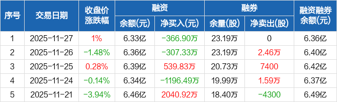 福斯特:融资净偿还366.9万元,融资余额6.33亿元(11-27)