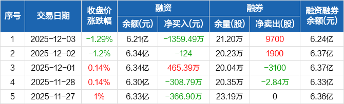 福斯特:融资净偿还1359.49万元,融资余额6.21亿元(12-03)