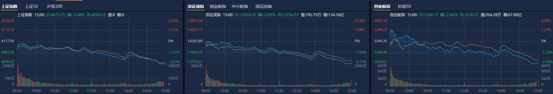2月首个交易日,市场全天震荡调整,三大指数均跌超2%。截至收盘,沪指跌2.48%,深成指跌2.69%,创业板指跌2.46%。沪深两市成交额2.58万亿,较上一个交易日缩量2508亿。盘面上,全市场超4600只个股下跌,其中123只个股跌停。从板块来看,白酒概念反复活跃,皇台酒业3连板,金徽酒3天2板,水井坊触及涨停。电网设备概念逆势走强,汉缆股份、白云电器、三变科技、保变电气等多股涨停。下跌方面,有色金属、油气、化工、煤炭、半导体等板块跌幅居前。