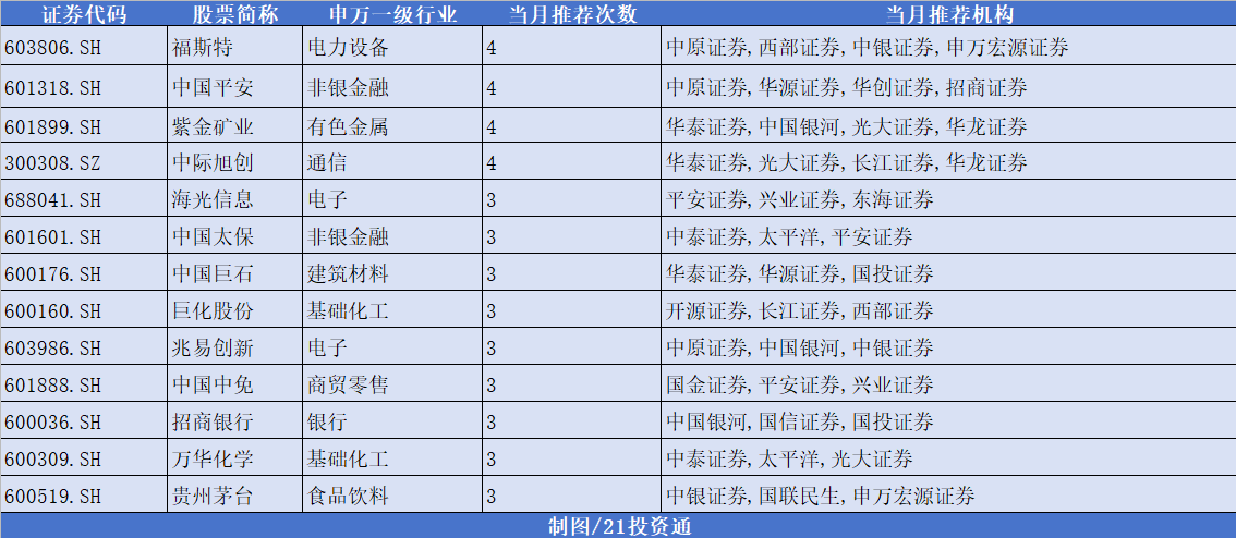 在统计的30余家券商2月金股中,福斯特、中国平安、紫金矿业、中际旭创等股获4次推荐;海光信息、中国太保、中国巨石等股紧随其后获3次推荐。