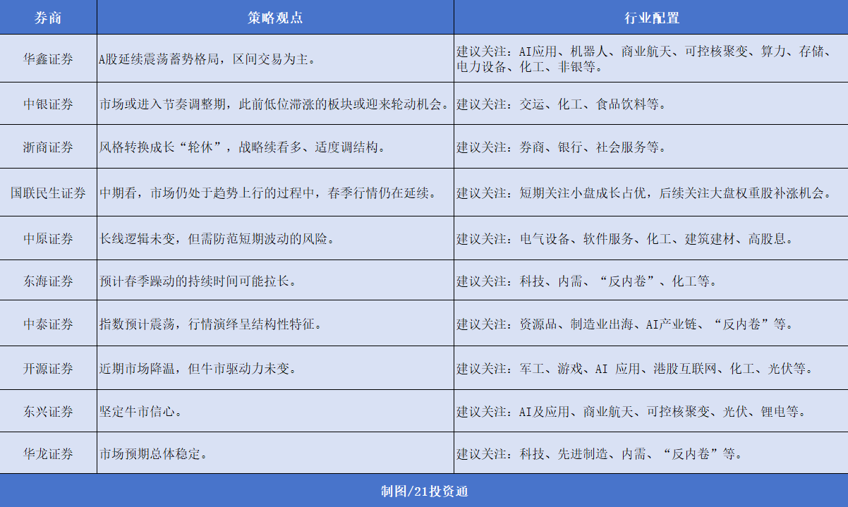 在行业配置方面,多家机构建议关注科技内部的高低切以及“反内卷”相关行业的景气修复。
