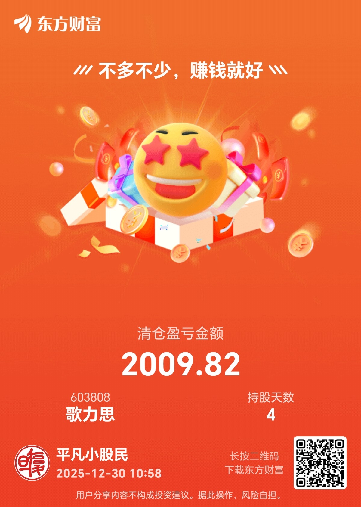 $歌力思(SH603808)$ 上周五买的,今天周二,持有了四天,我这个人有个优点就是不贪,赚了就走啊