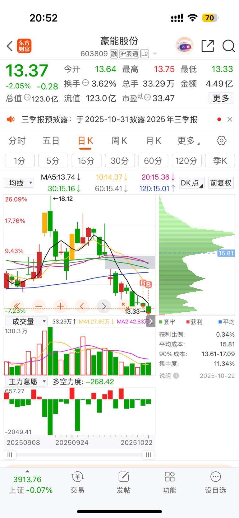 $豪能股份(SH603809)$ 十分之一仓位昨天建底仓,早盘利润微薄,下午继续加仓!持续保持亏损在1个点左右。以前都是右侧交易,中,这次挑战一下左侧交易!筹码峰看全是套牢盘,朋友说说地下室下面还会有地窖没有
