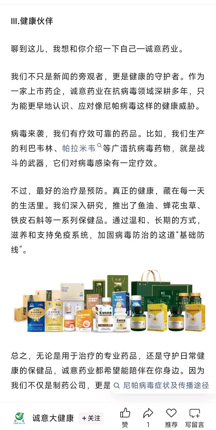 $诚意药业(SH603811)$ 病毒,公司公众号推文