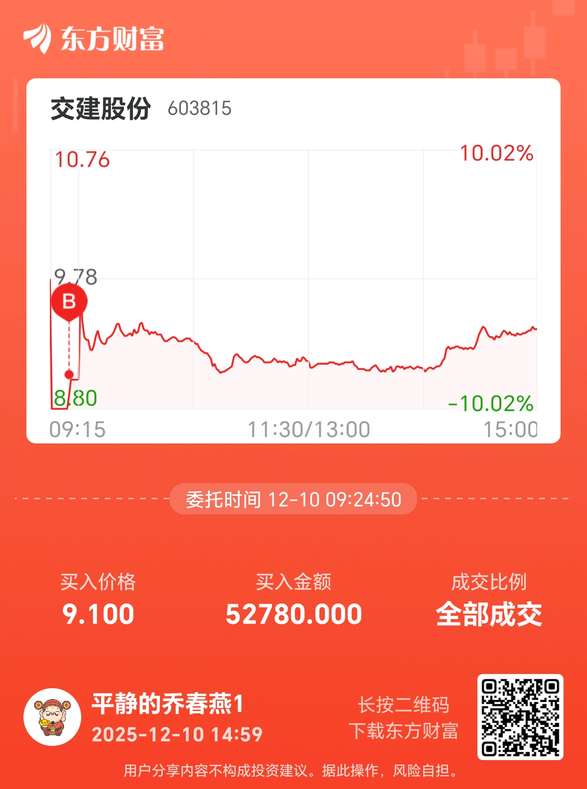 9块三毛九是上午算出来的收盘价格。其实当时买入的时候,我以为收盘还会高一些。有人