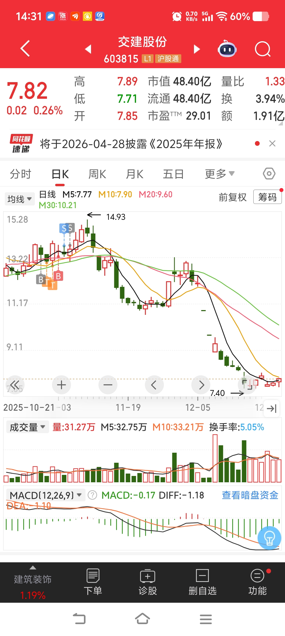 $交建股份(SH603815)$ 从老子清仓你这垃几玩意跌了快一半,笑死