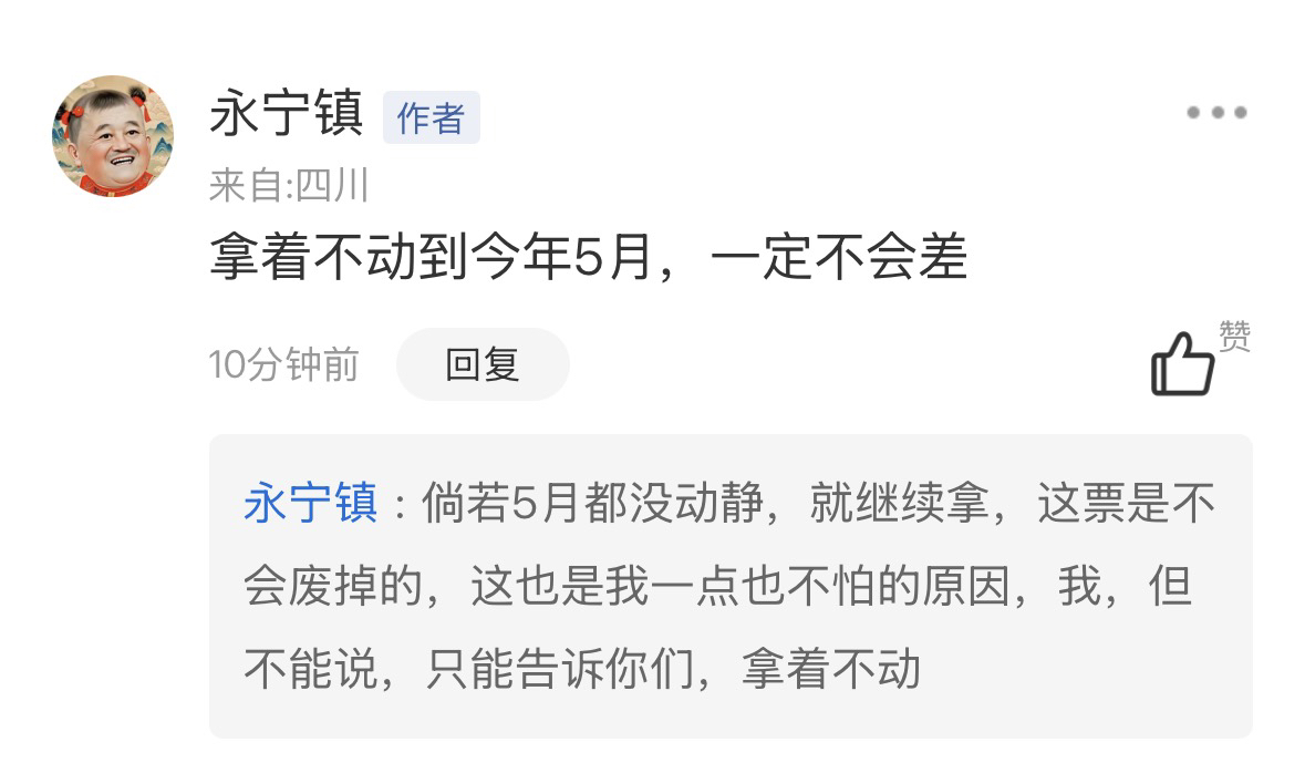 温馨提示: 1.根据《证券法》规定,禁止编造、传播虚假信息或者误导性信息,扰乱证券市场;2.用户在本社区发表的所有资料、言论等仅代表个人观点,与本网站立场无关,不对您构成任何投资建议。用户应基于自己的独立判断,自行决定证券投资并承担相应风险。《东方财富社区管理规定》