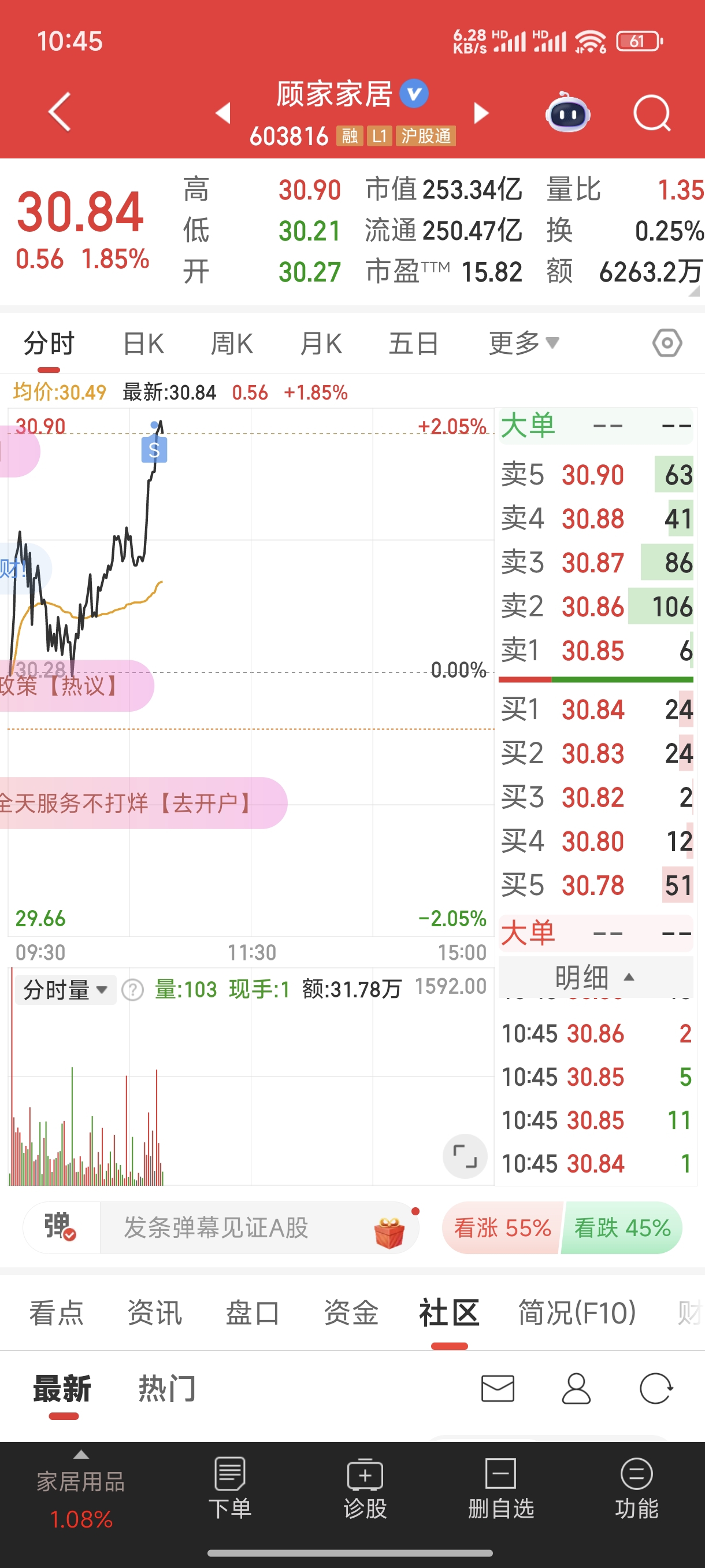 $顾家家居(SH603816)$ 把昨天加的t了,留底仓,昨天加的赚了1个点