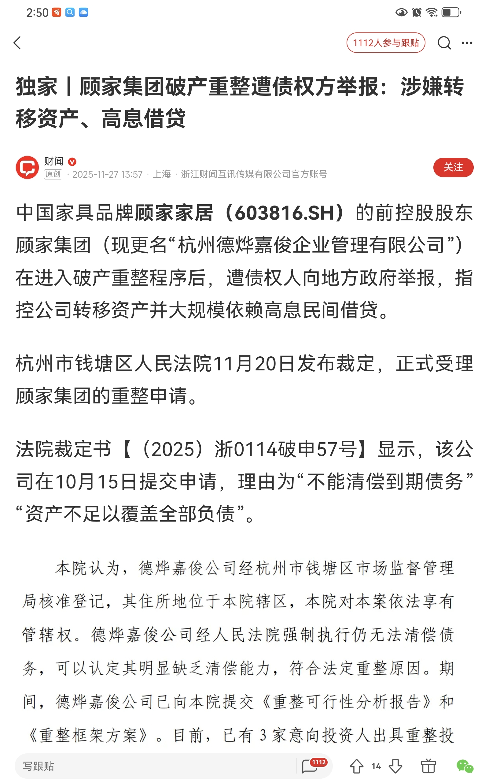 $顾家家居(SH603816)$ 重整有变数?不过举报的都能理解,转移利润,掏空公司,钱归老板,债归公司