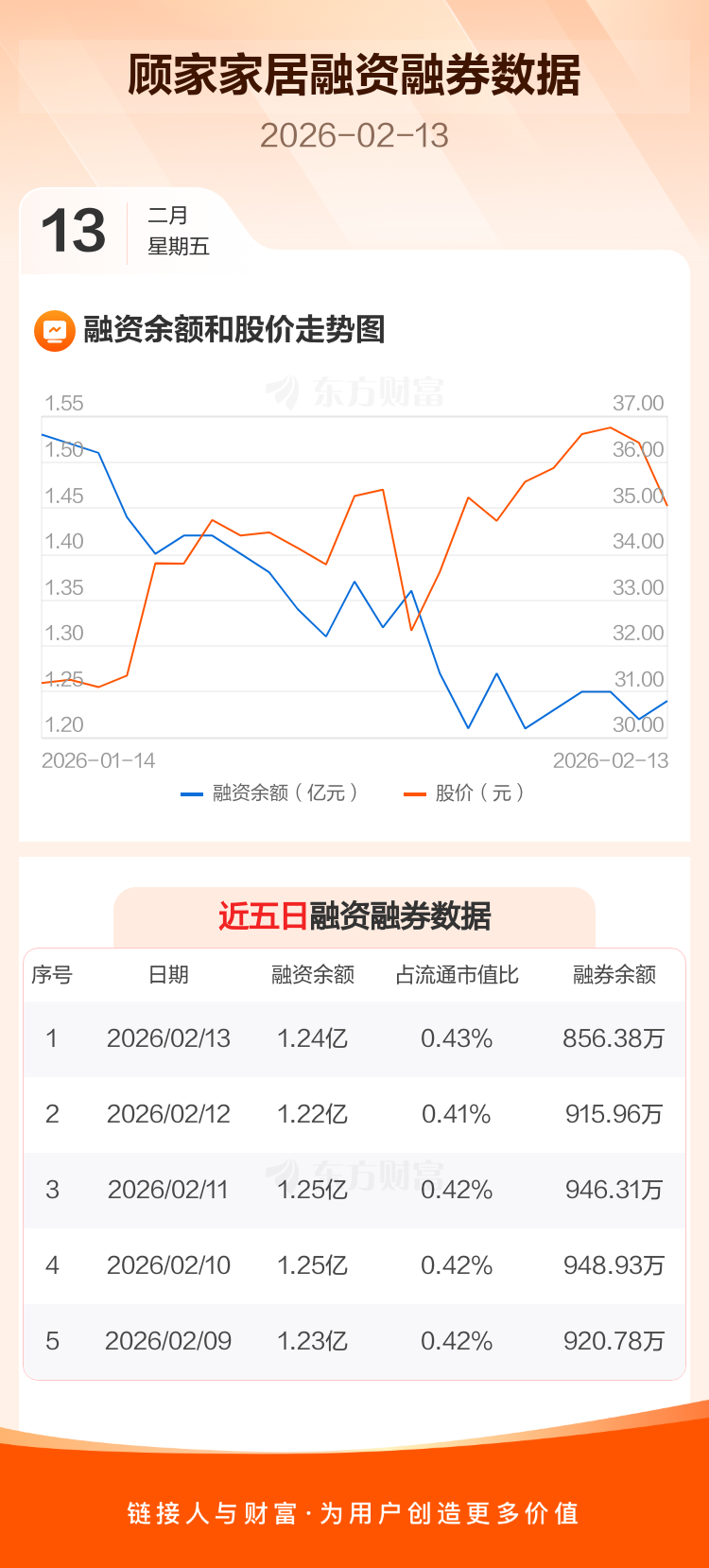 交易所最新数据显示,顾家家居于2026年2月13日获融资买入710.32万元,融资偿还541.22万元,当日融资净买入169.09万元。目前,该股融资余额1.24亿,占流通市值比例为0.43%。