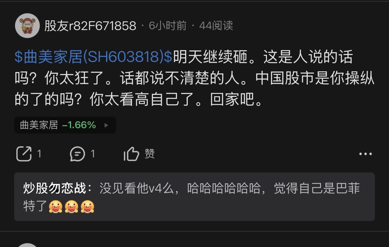 $曲美家居(SH603818)$ 啥也别说了小五,看看谁在嘲讽你哈哈哈,是不是炒股勿恋战?