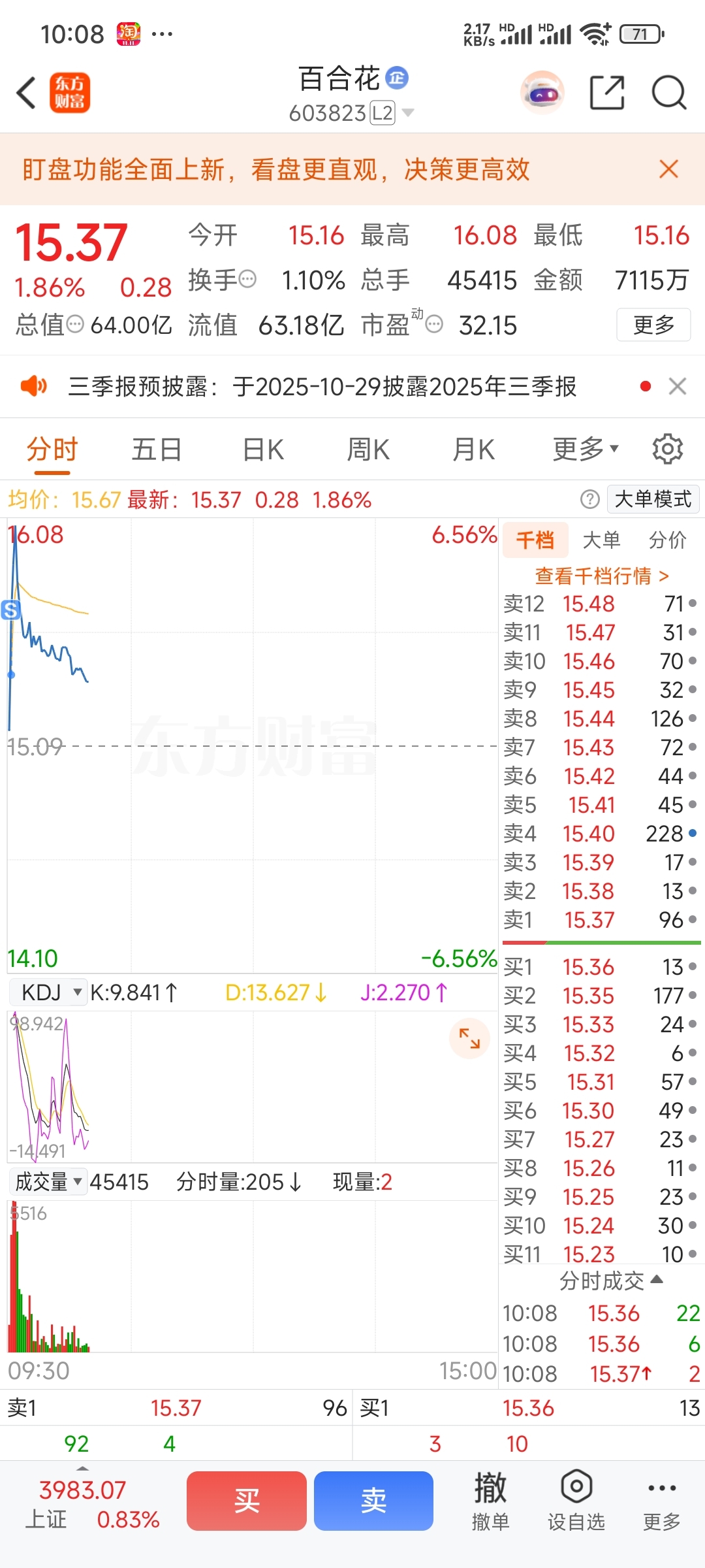 $百合花(SH603823)$ 竞价我就卖了。居然冲了16.后面是不是持续跌落。