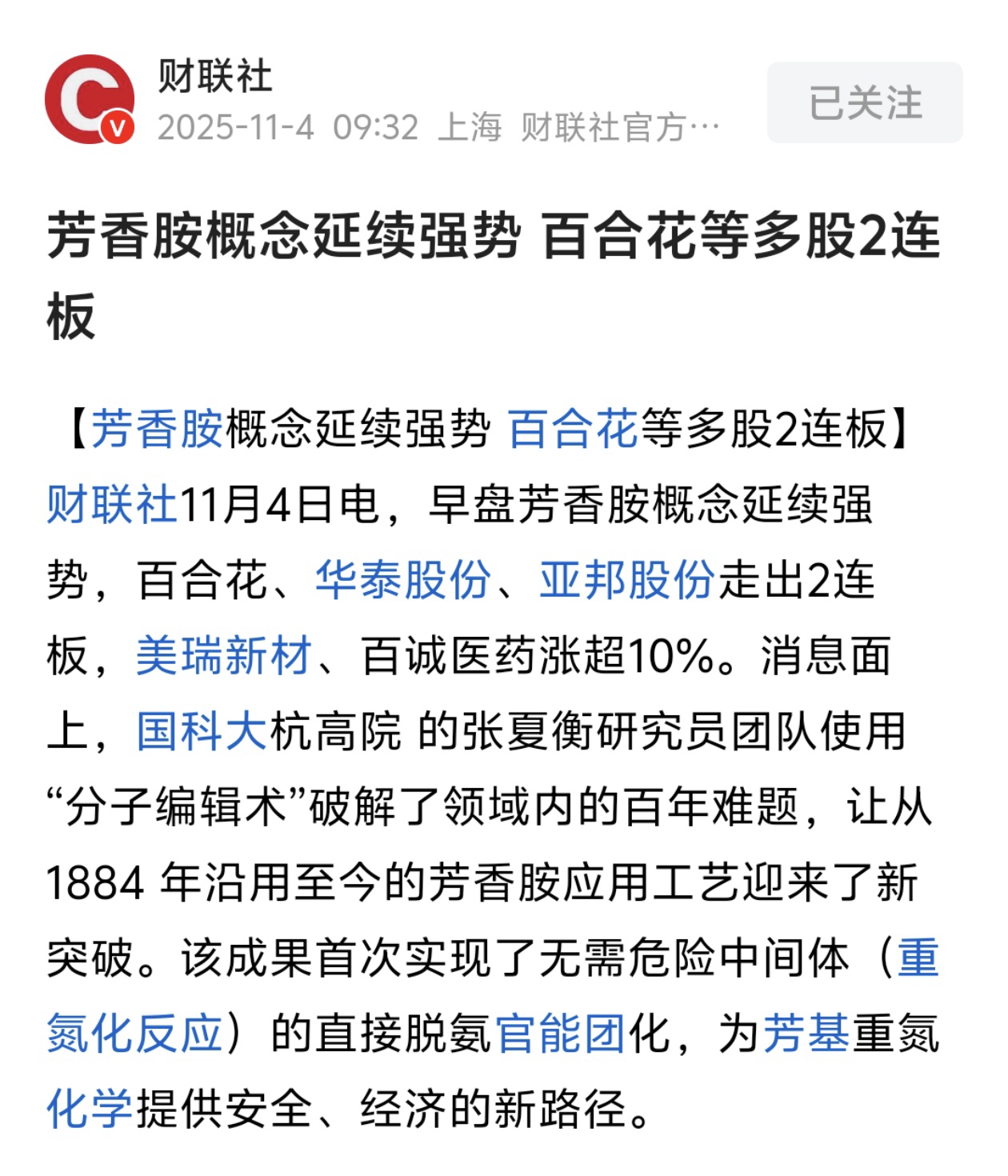 $百合花(SH603823)$ 芳香胺:诺奖级技术突破引爆化工医药今日最核心的焦点,是国科大杭高院张夏衡教授团队在《自然》(Nature)杂志上发表的关于“N-硝基胺介导直接脱氨官能团化”的研究成果 。产业影响:新工艺预计能将芳香胺的转化流程大幅简化,实现安全、廉价地合成新药。有观点称,抗癌药等中间体的成本有望降低40%-50% 。