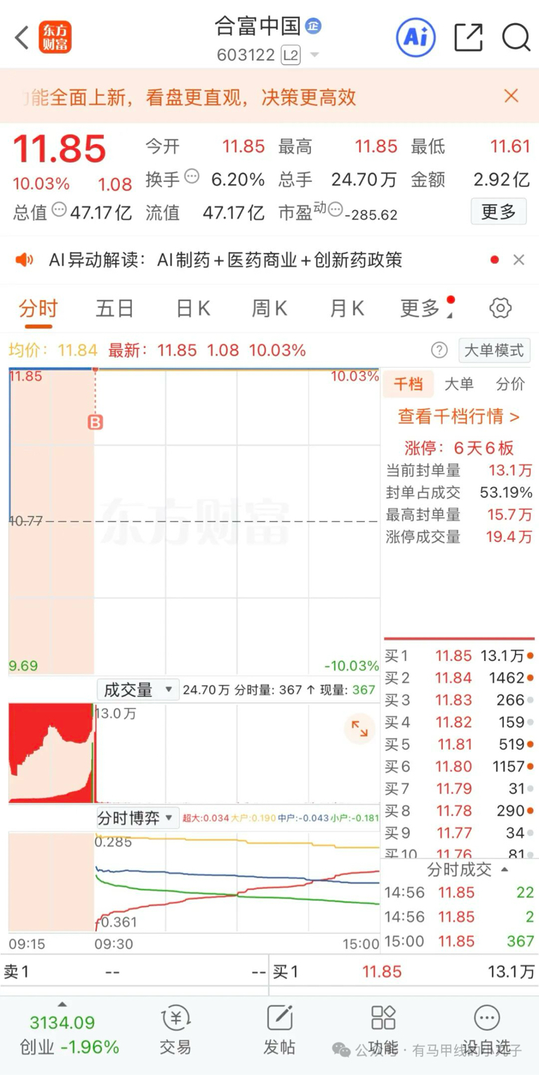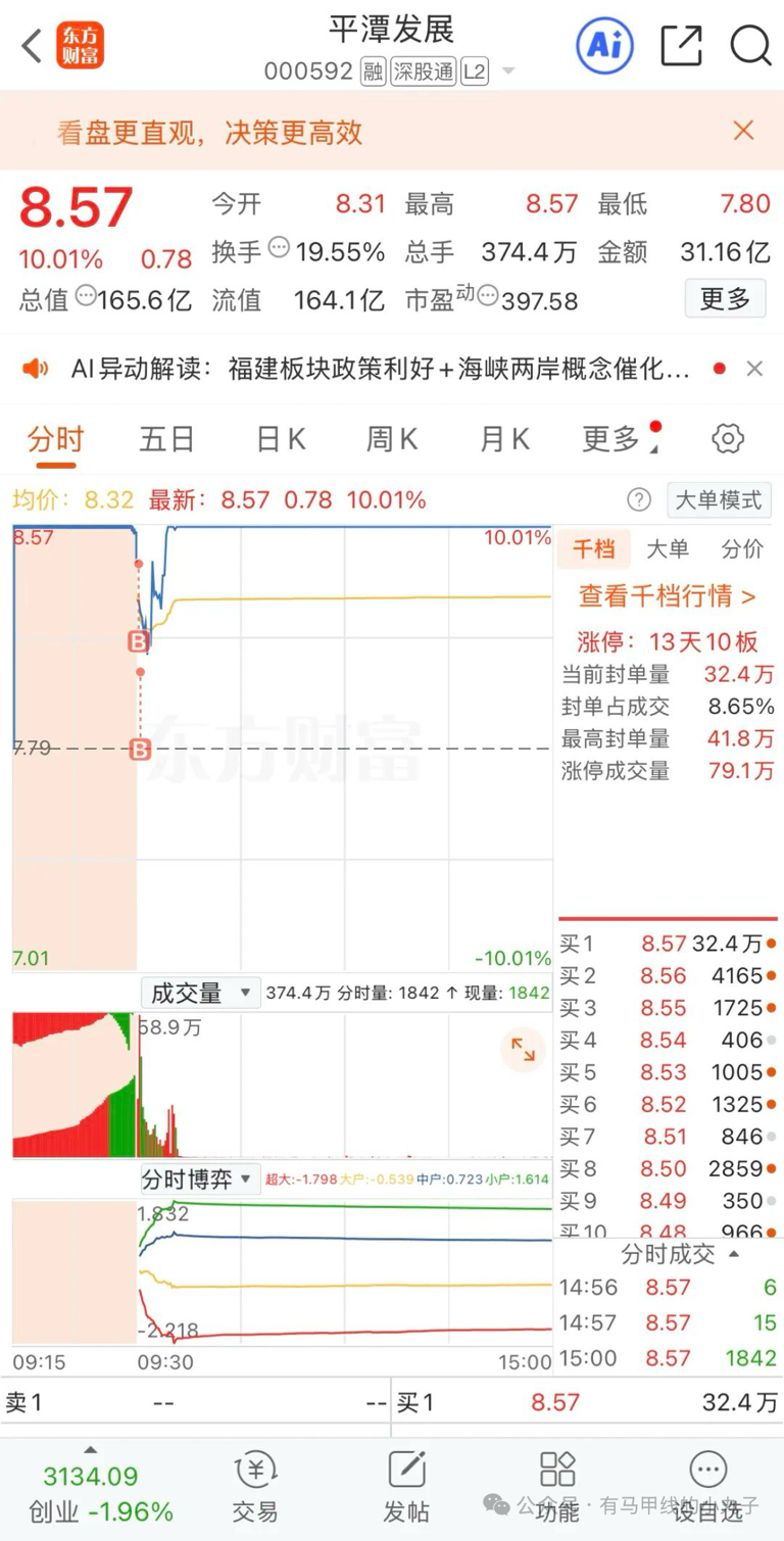 开盘后合富秒板,福建金森、福龙马旱地拔葱深水捞起,平潭震荡后封板,情绪接力达到高峰。