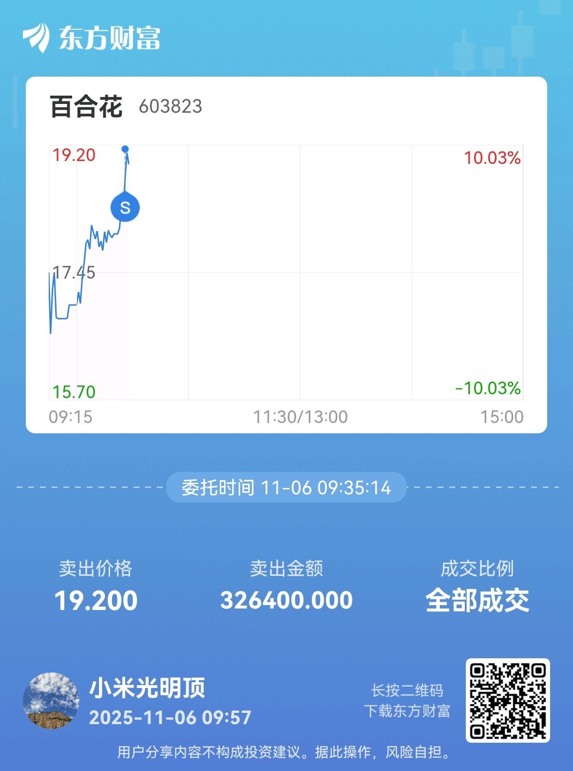 $百合花(SH603823)$ 涨停卖出不香吗?