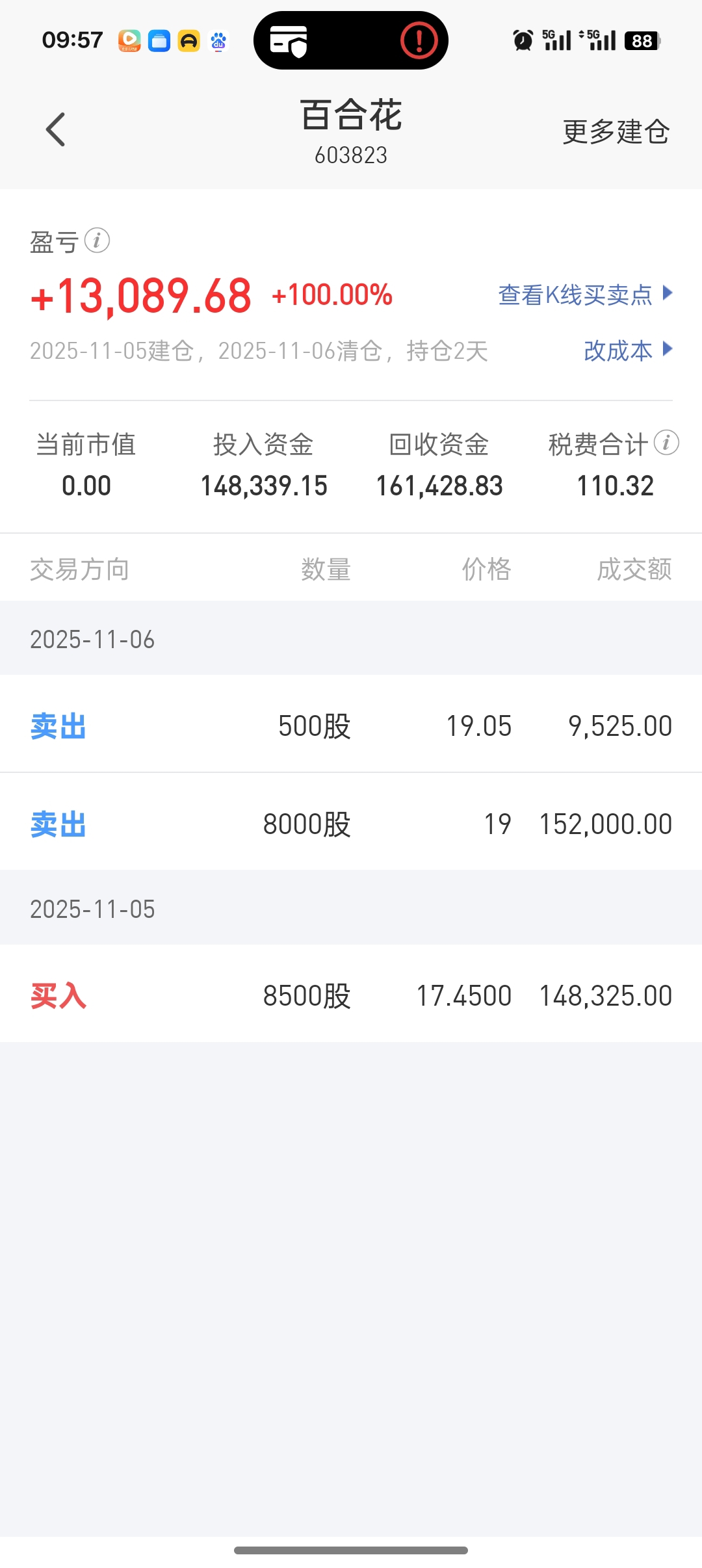 $百合花(SH603823)$ 感谢主力不杀之恩,昨天上午跌停买入,到收盘还有2.5万手封跌停,以为今天要亏1.4万,结果今天居然涨停卖了,倒赚1.3万,一来一回血赚2.7万,感谢主力不杀之恩。