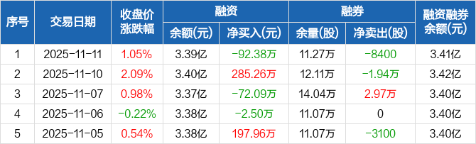 坤彩科技:融资净偿还92.38万元,融资余额3.39亿元(11-11)
