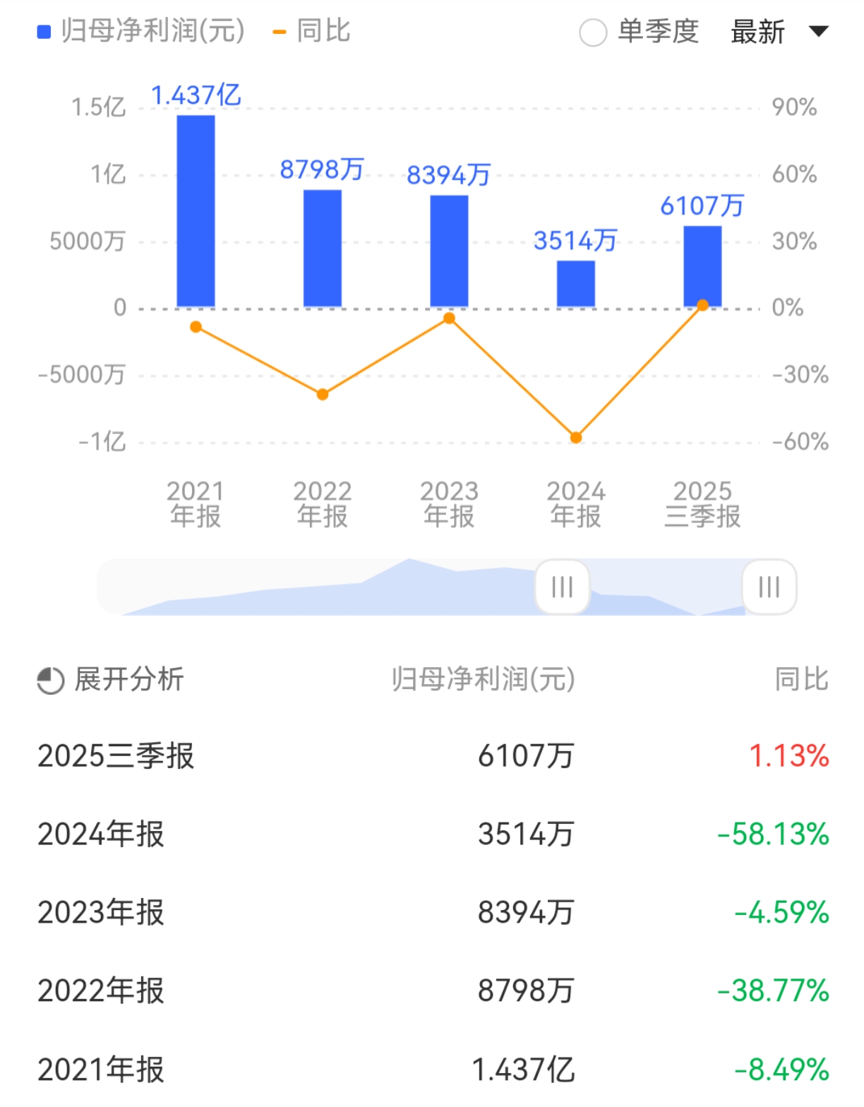 2025年前三季度,公司营业收入为8.56亿元,同比增长7.85%;归母净利润为6107.37万元,同比增长1.13%;扣非归母净利润为5551.53万元,同比增长4.71%。