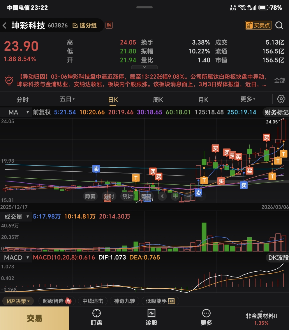 $坤彩科技(SH603826)$ 是不是该回调了?还是要开始连板了?纠结中