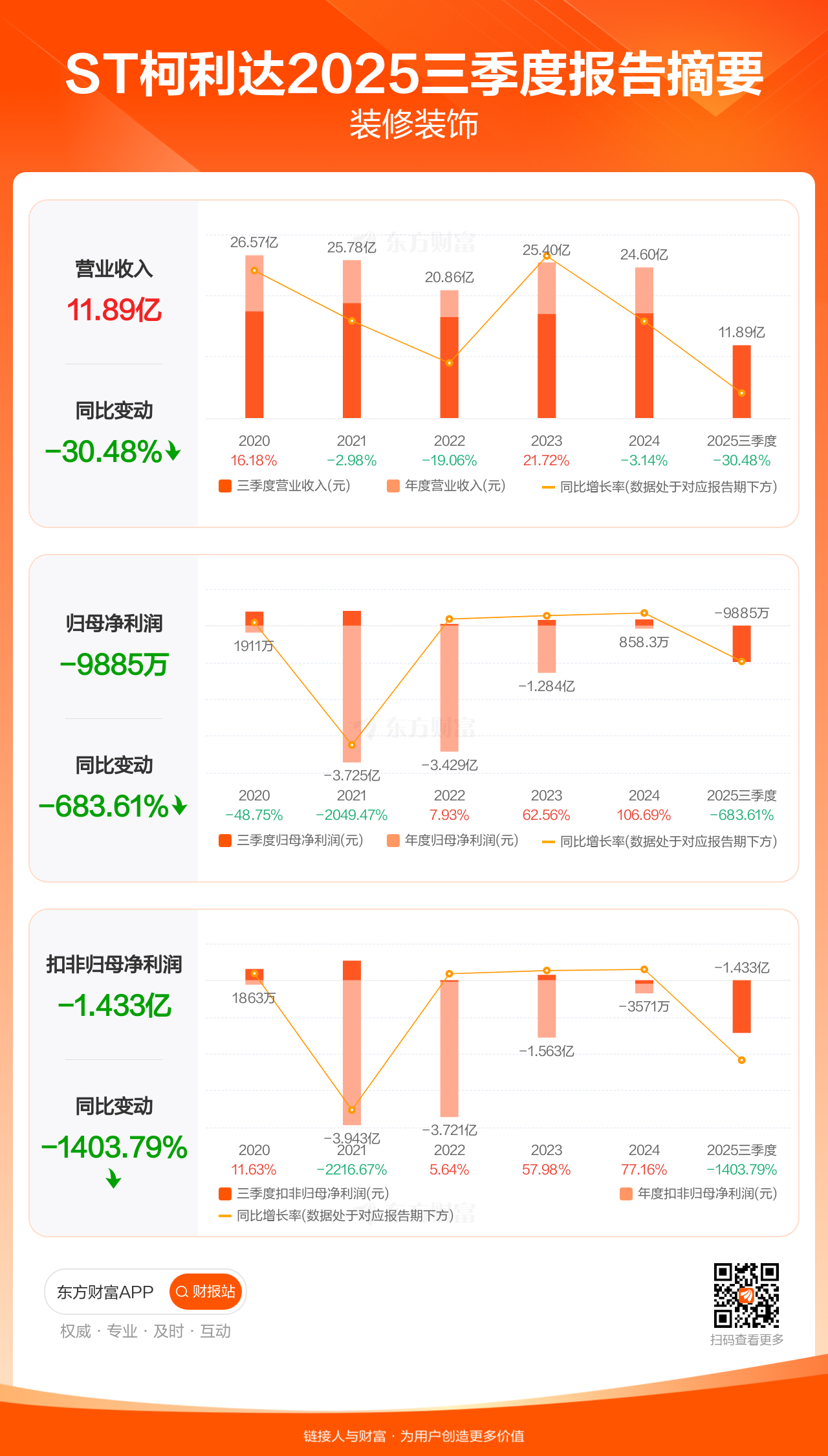 ST柯利达10月31日发布2025年三季报显示,公司前三季实现营业收入11.89亿元,同比下滑30.48%;归母净利润-9884.87万元;扣非归母净利润-1.43亿元。