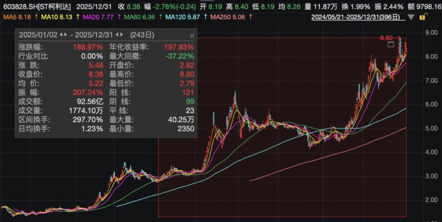 2025年,ST柯利达股价累计大涨近189%。截至12月31日收盘,该股报8.38元/股,总市值为50亿元。