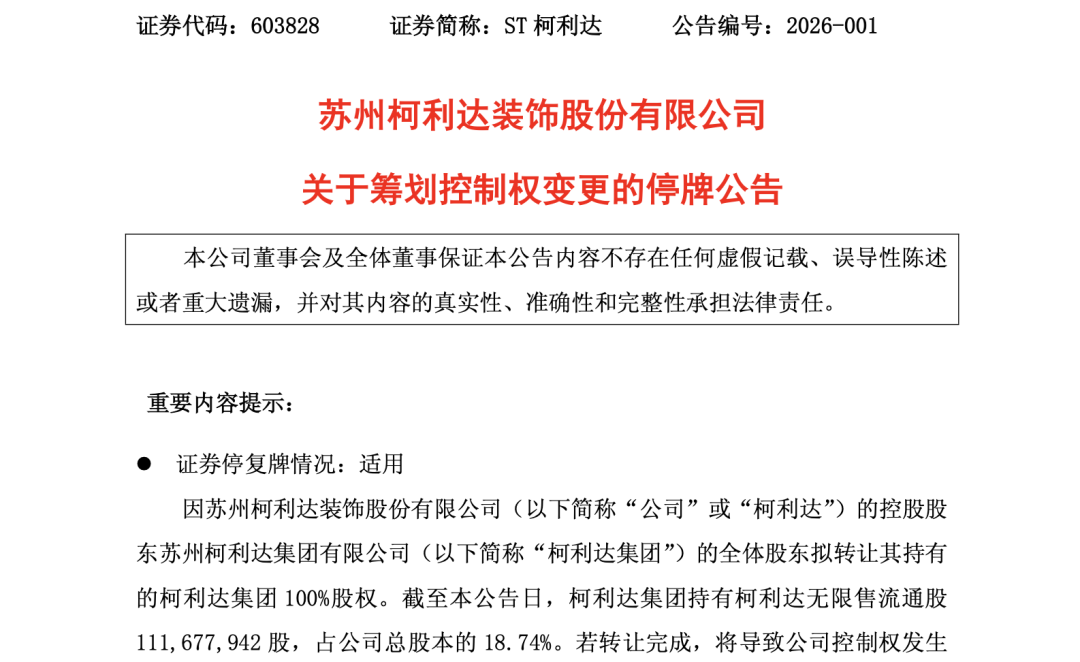 12月31日,ST柯利达发布公告称,公司控股股东苏州柯利达集团有限公司(以下简称柯利达集团)的全体股东拟转让其持有的柯利达集团100%股权。若转让完成,将导致公司控制权发生变更。