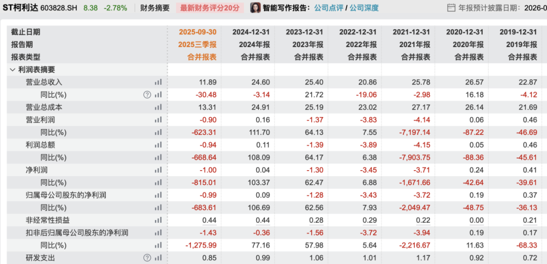 业绩方面,ST柯利达2025年前三季度实现营业收入11.89亿元,同比下降30.48%;归母净利润为9884.87万元,同比下降683.61%。拉长时间来看,业绩表现不稳定。