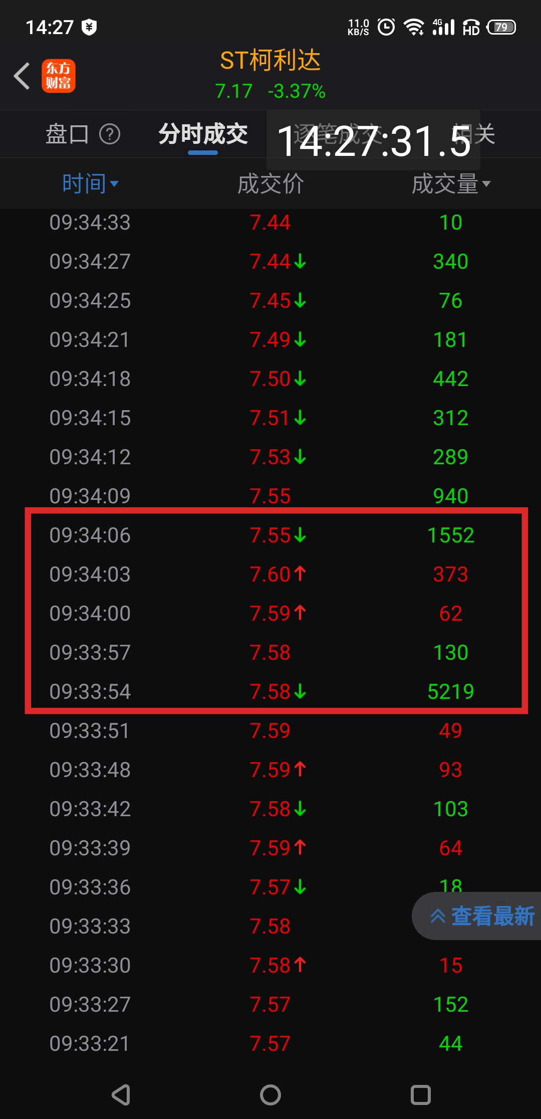 $ST柯利达(SH603828)$ 早盘冲高9:33:56秒5000+卖单!10秒左右的决策时间没反应过来,还是太贪了。没卡时间节点卖!以后有大单卖就不该抱幻想!还好早盘减掉一半了!不然今天亏大发了!