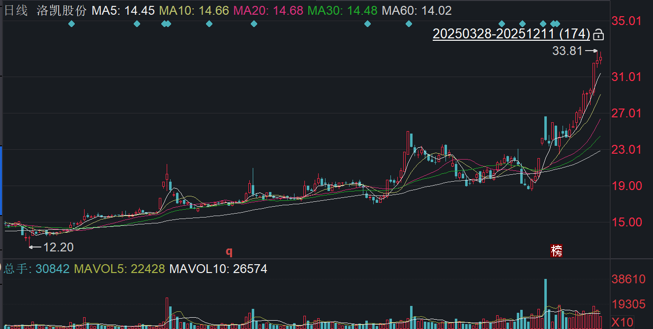 二级市场上,截至12月11日收盘,洛凯股份上涨1.22%报33.14元/股,总市值约61.73亿元,今年来公司股价累计上涨147.65%。