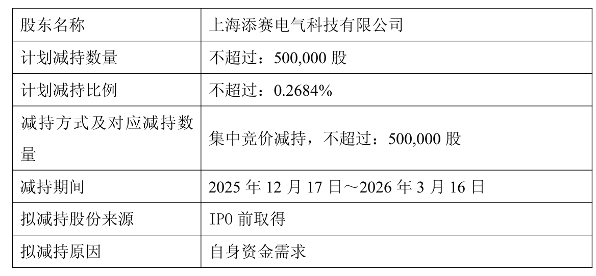 值得一提的是,洛凯股份另一股东正进行减持计划。公司持股4.3882%股东添赛电气计划在2025年12月17日至2026年3月16日减持不超过50万股,占公司总股本的0.2684%。