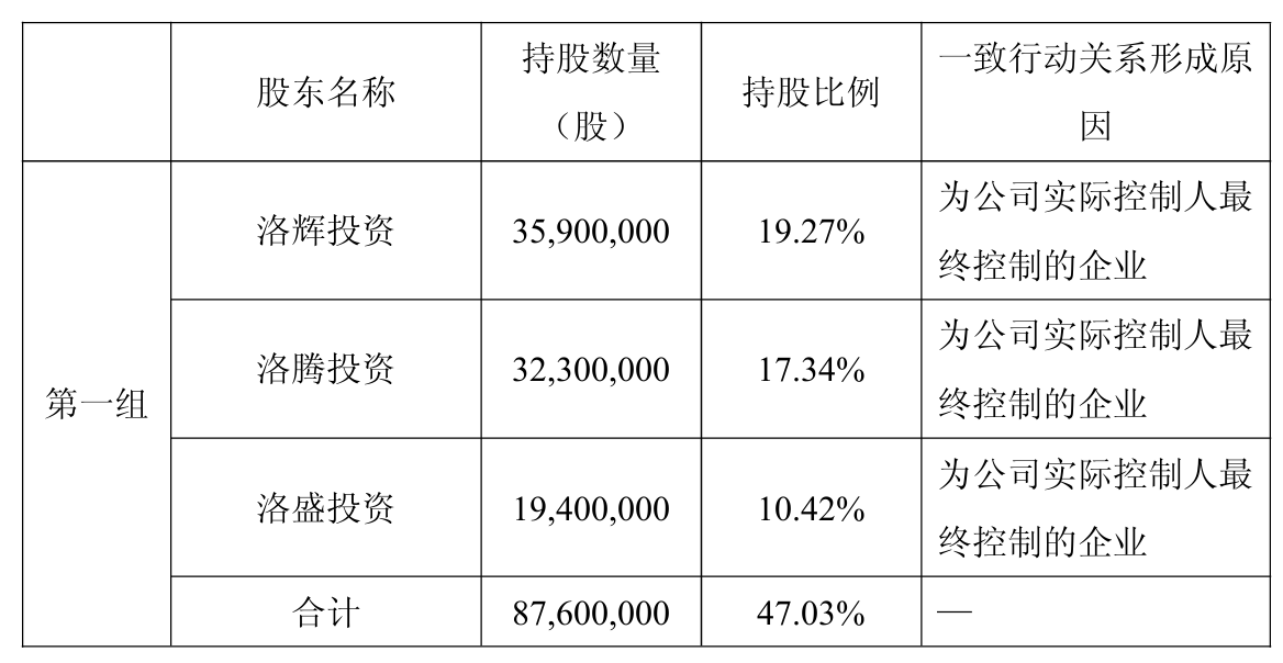 洛辉投资、洛腾投资、洛盛投资为一致行动人,合计持有公司股份8760万股,占公司总股本的47.03%,所持股份均为IPO前取得。