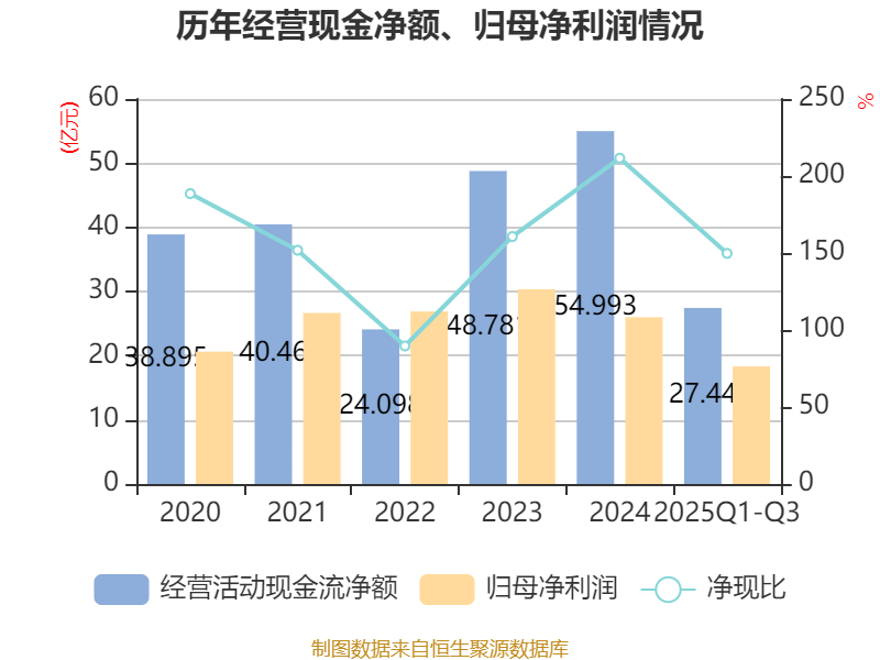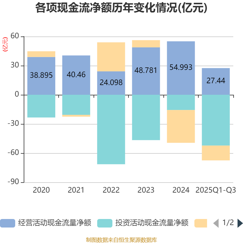 2025年前三季度,公司经营活动现金流净额为27.44亿元,同比增长1.61%;筹资活动现金流净额-15.25亿元,同比减少4.63亿元;投资活动现金流净额-52.27亿元,上年同期为-36.47亿元。
