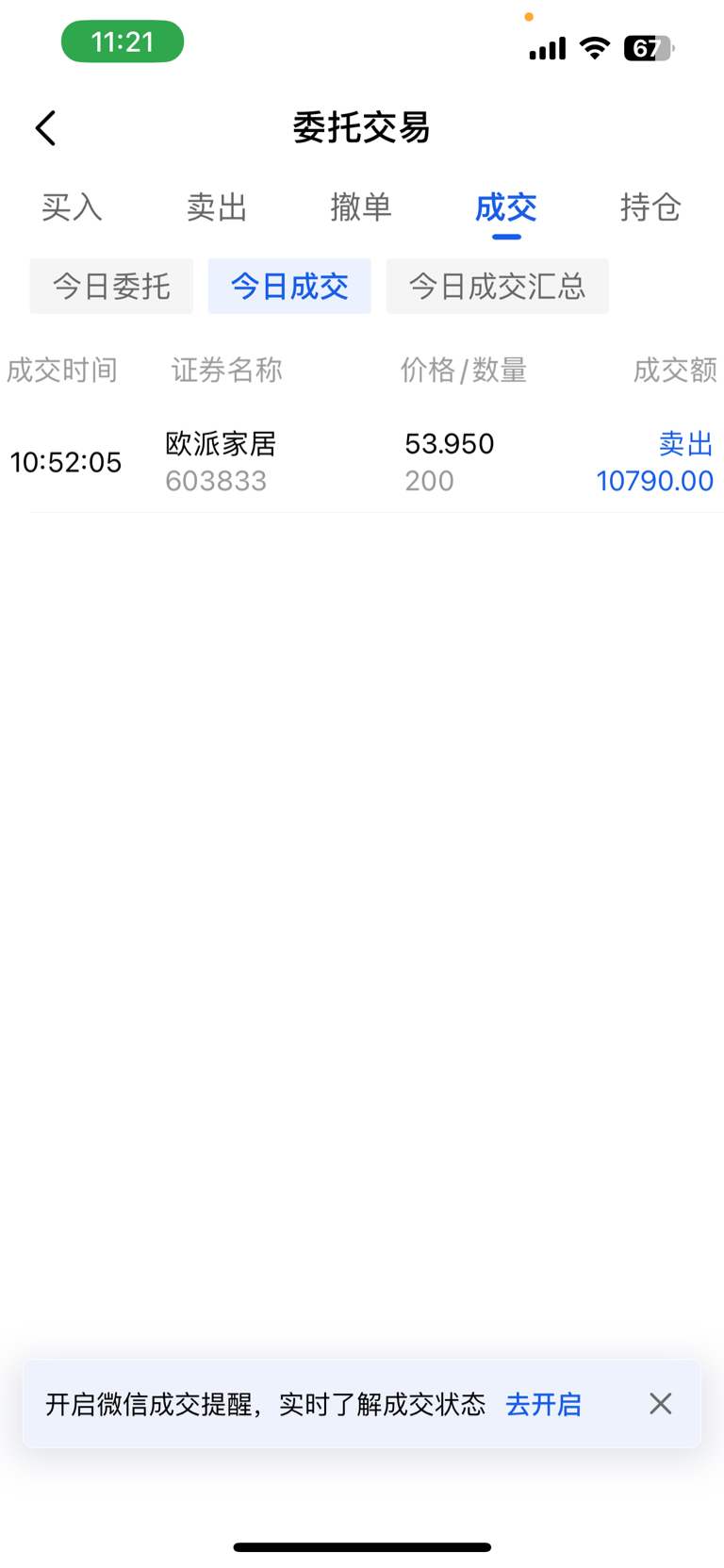 $欧派家居(SH603833)$ 刚刚看了一下,早上挂的又成了,下午看有没有机会接回来,每天折腾。
