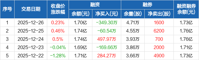 欧派家居:融资净偿还349.3万元,融资余额1.7亿元(12-26)