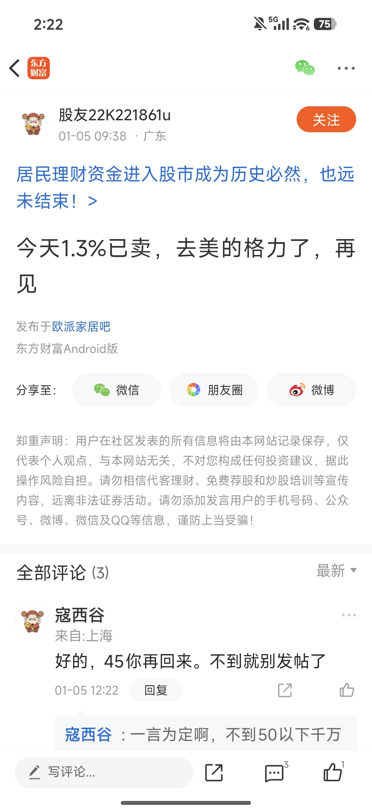 $欧派家居(SH603833)$ 没见过这么无齿的人,小丑一个。45没到,怎么又出来蹦哒了。