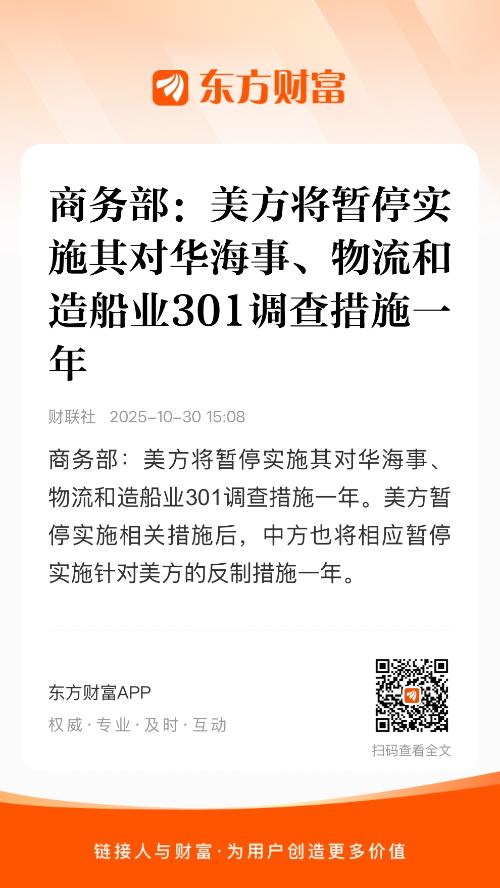 今天,商务部新闻发言人介绍中美经贸磋商成果共识时提到,美方将暂停实施其对华海事、物流和造船业301调查措施一年。美方暂停实施相关措施后,中方也将相应暂停实施针对美方的反制措施一年。