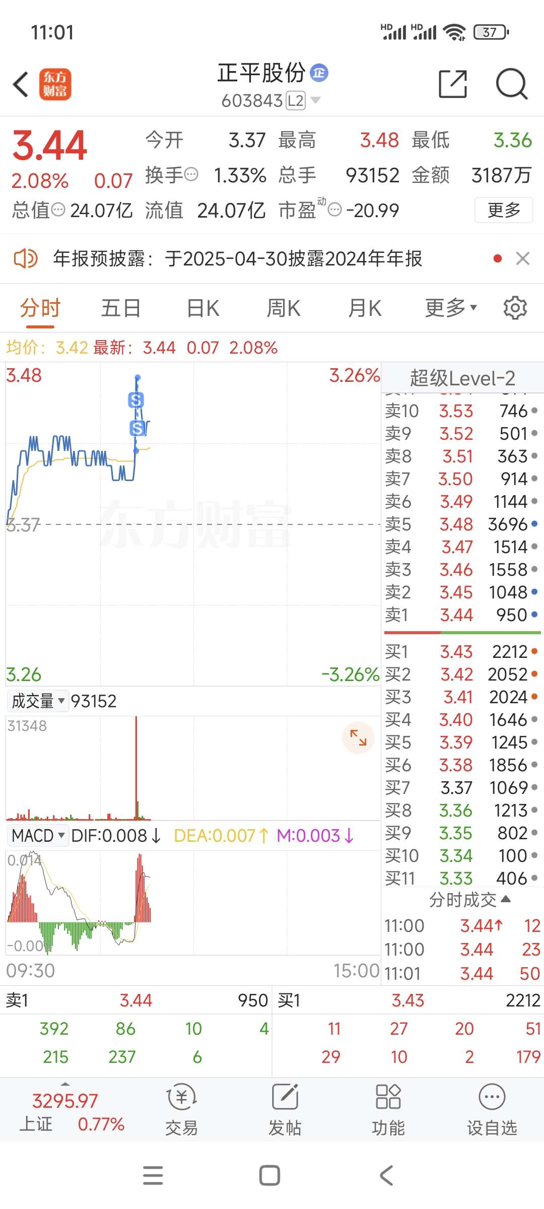 $正平股份(SH603843)$ 初生,我挂了一早上3.44看没戏,撤单改3.42然后直接吃了