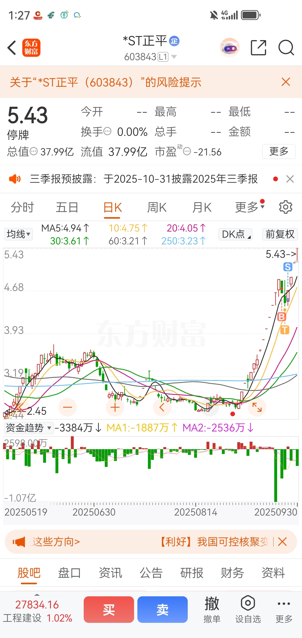 $*ST正平(SH603843)$ 这个票亏钱的路过