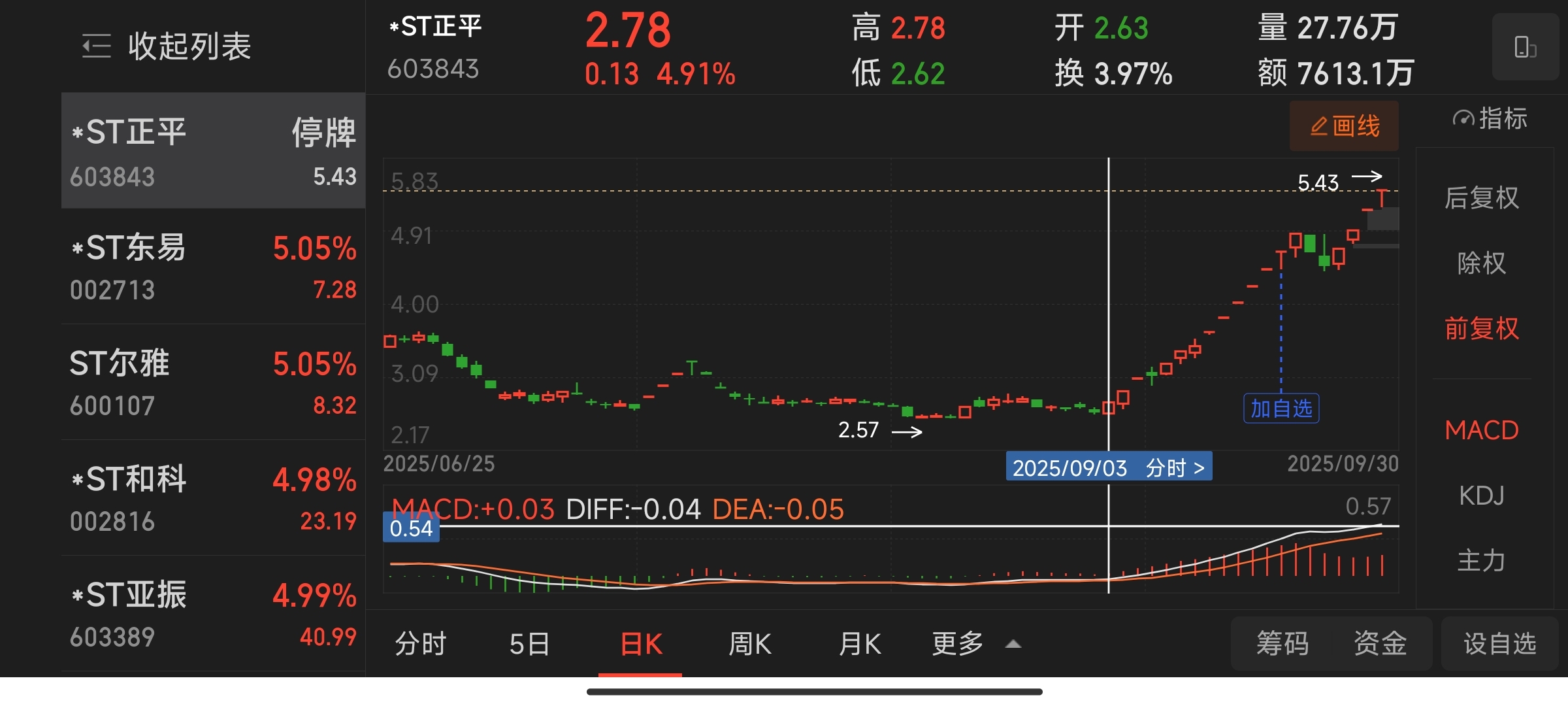 $*ST正平(SH603843)$ 正平这票从9月3号2.78起涨到9月30号5.43,严格意义上来说,实打实的一字涨停板也就只有六个而已,主要是靠换手板走上来的,所以不要担心买不进正平,只要你想进,有的是机会进,未必就会连续一字涨停,
