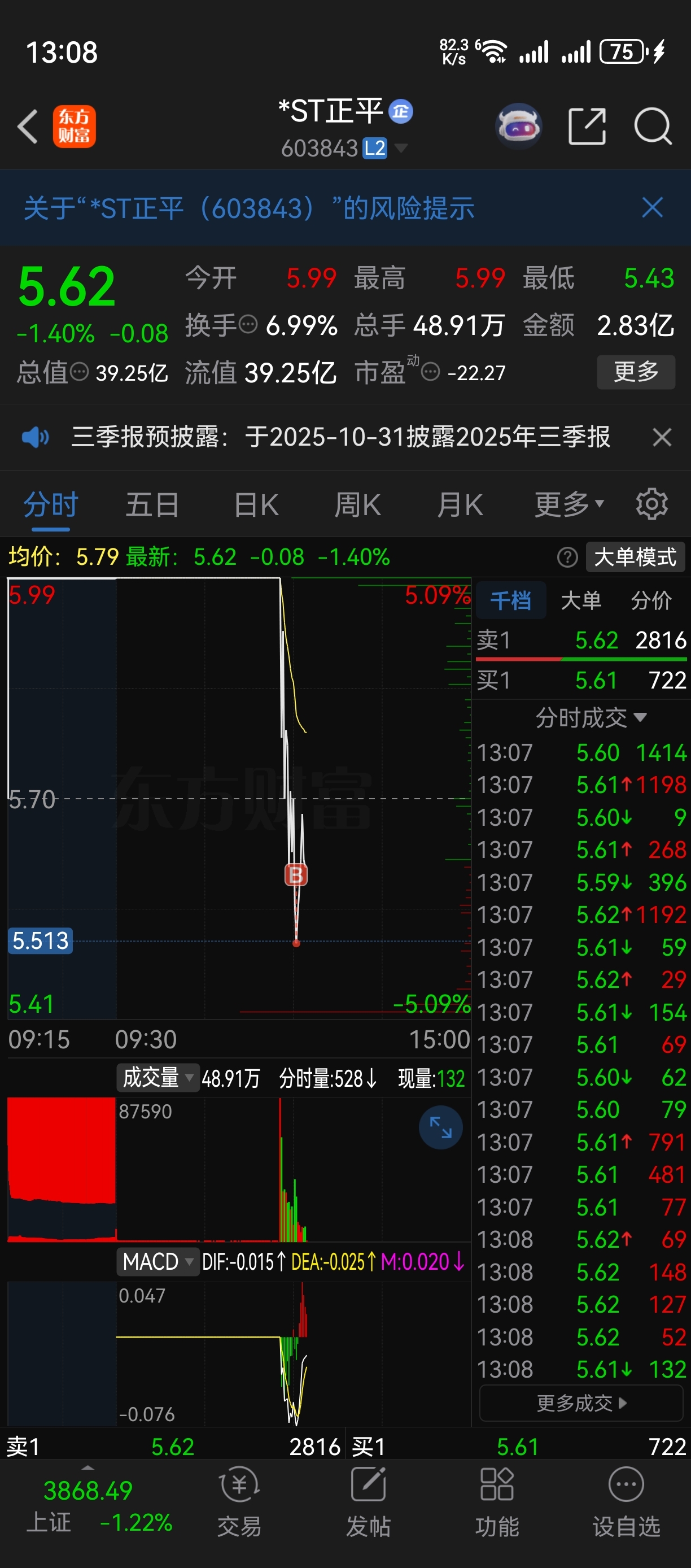 $*ST正平(SH603843)$ 唯一不满意的就是涨停没出南置,没有梭哈正平