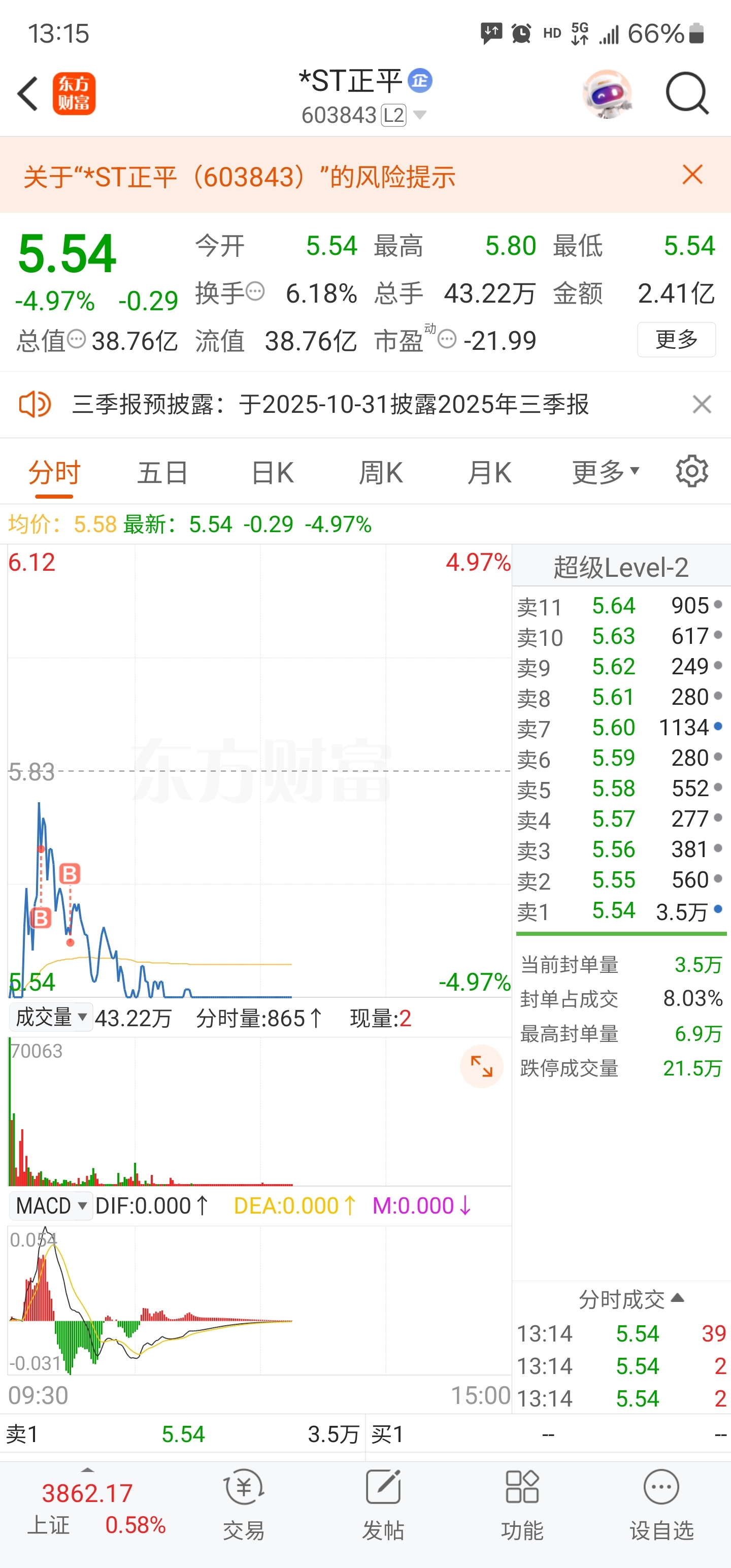 $*ST正平(SH603843)$ 兄弟们是我的错,我不该买,越买越低