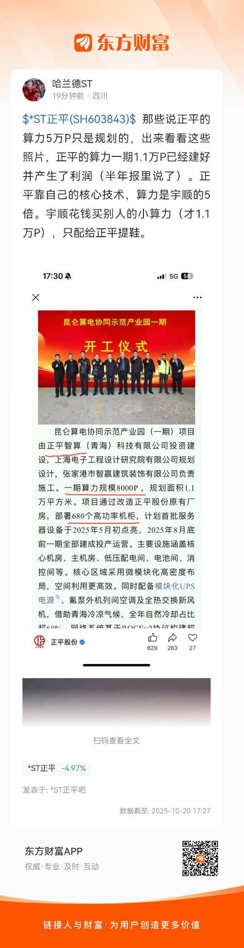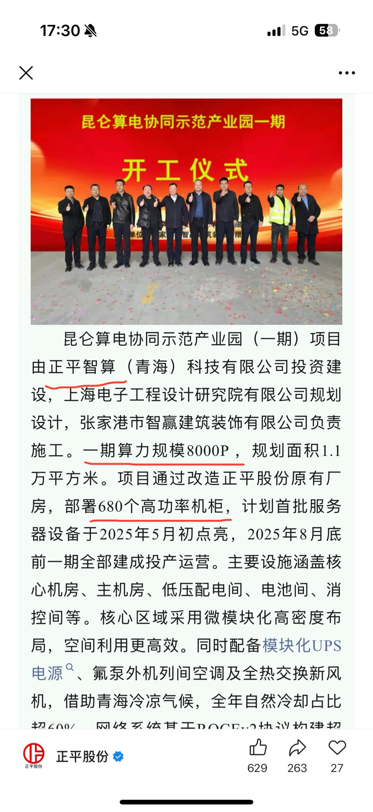 $*ST正平(SH603843)$ 那些说正平的算力5万P只是规划的,出来看看这些照片,正平的算力一期1.1万P已经建好并产生了利润(半年报里说了)。正平靠自己的核心技术,算力是宇顺的5倍。宇顺花钱买别人的小算力(才1.1万P),只配给正平提鞋。
