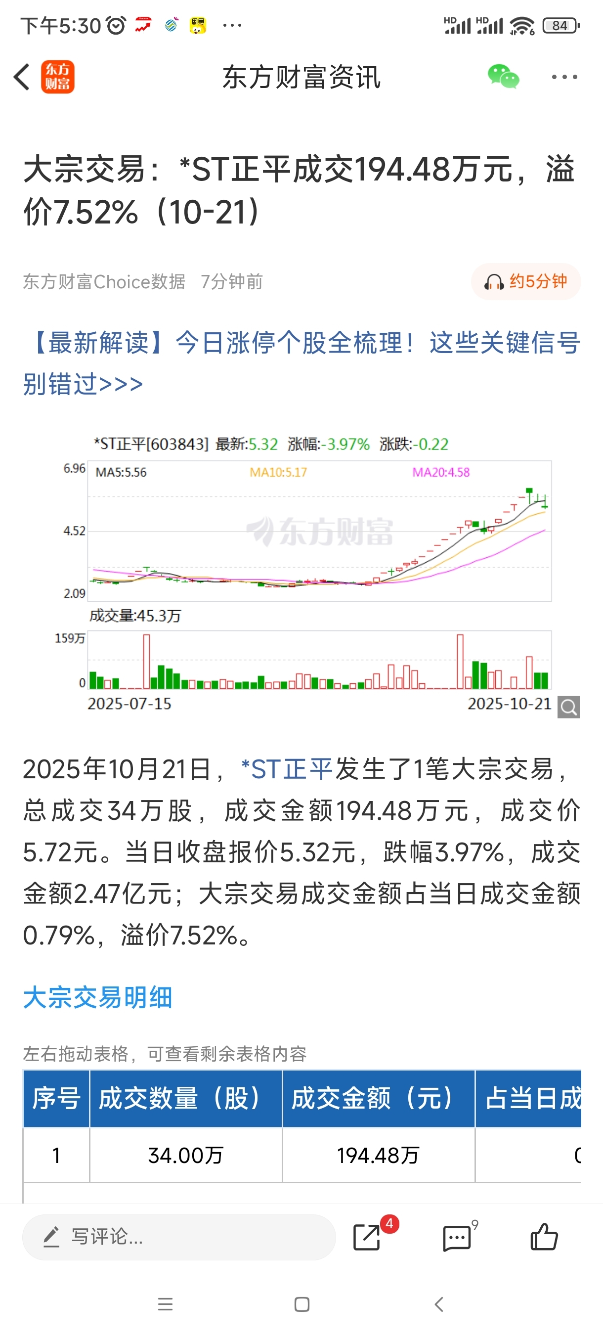 $*ST正平(SH603843)$ 大家可以看一下前几次大宗,溢价购买的的基本上都是隔天涨价的