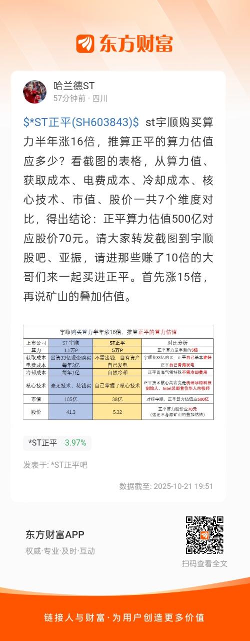 $*ST正平(SH603843)$ st宇顺购买算力半年涨16倍,推算正平的算力估值应多少?看截图的表格,从算力值、获取成本、电费成本、冷却成本、核心技术、市值、股价一共7个维度对比,得出结论:正平算力估值500亿对应股价70元。请大家转发截图到宇顺股吧、亚振,请进那些赚了10倍的大哥们来一起买进正平。首先涨15倍,再说矿山的叠加估值。