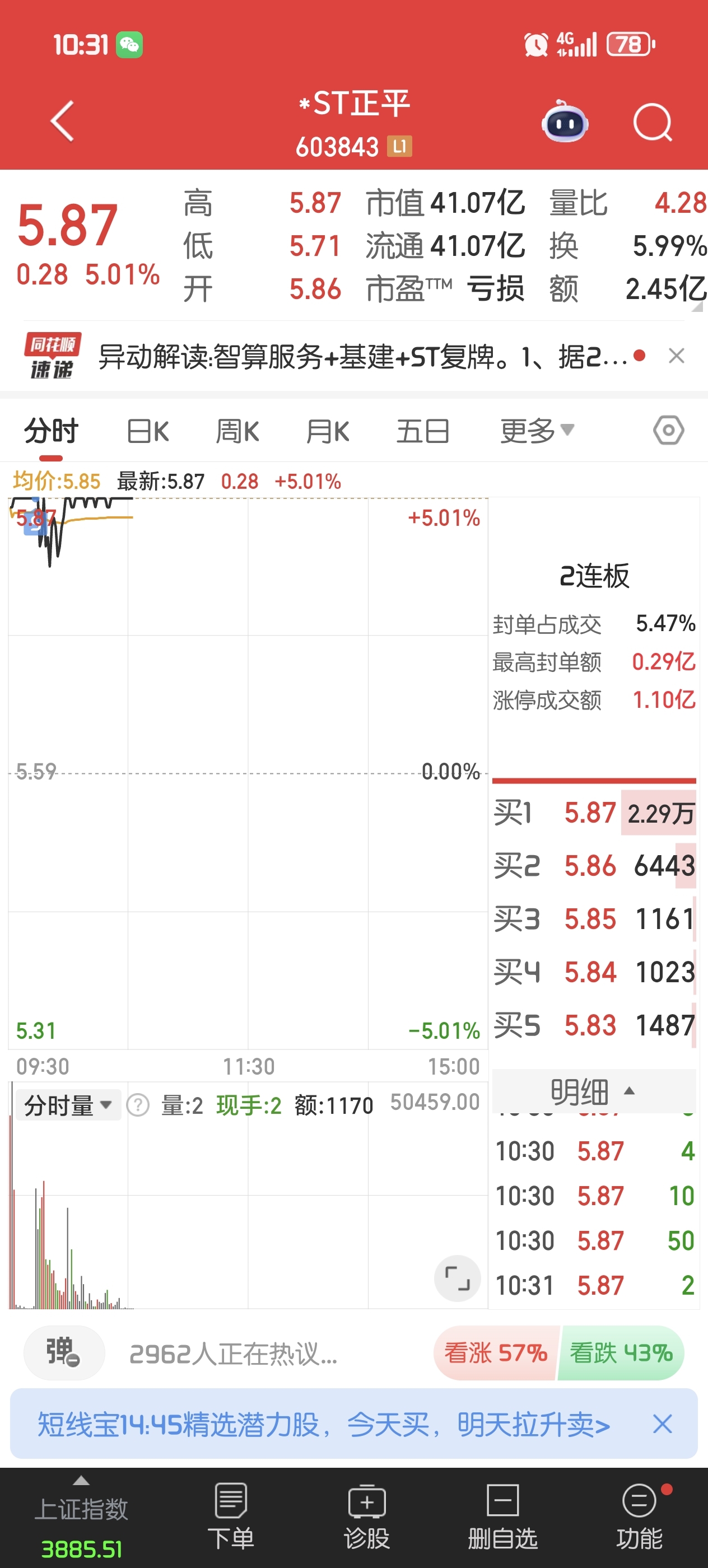 $*ST正平(SH603843)$ 知道要卡异动,就想做t了,2.72想接没接到,直接又拉上去了,