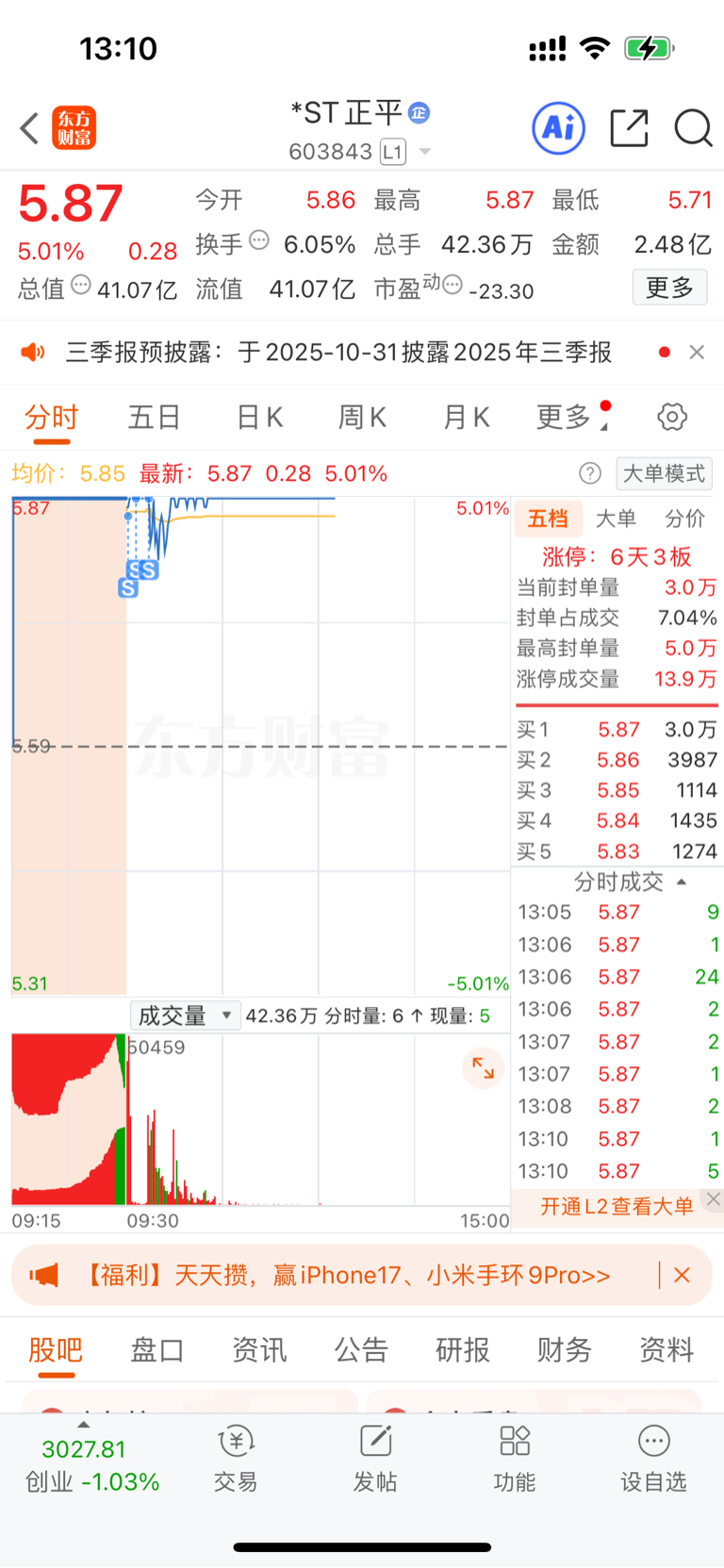 $*ST正平(SH603843)$ 我能怎么办,我也很无奈。被已了一大半。