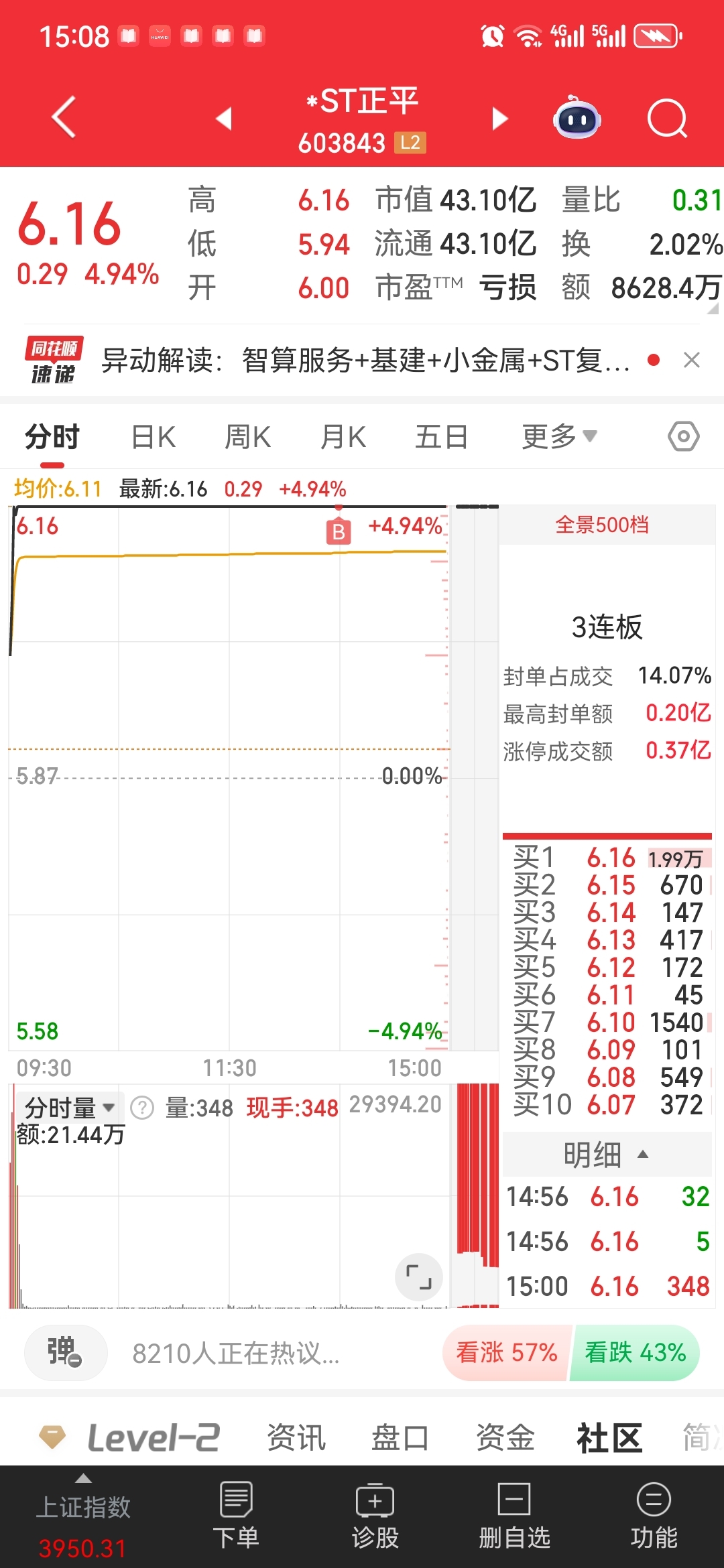 $*ST正平(SH603843)$ 今天又挤了点进来
