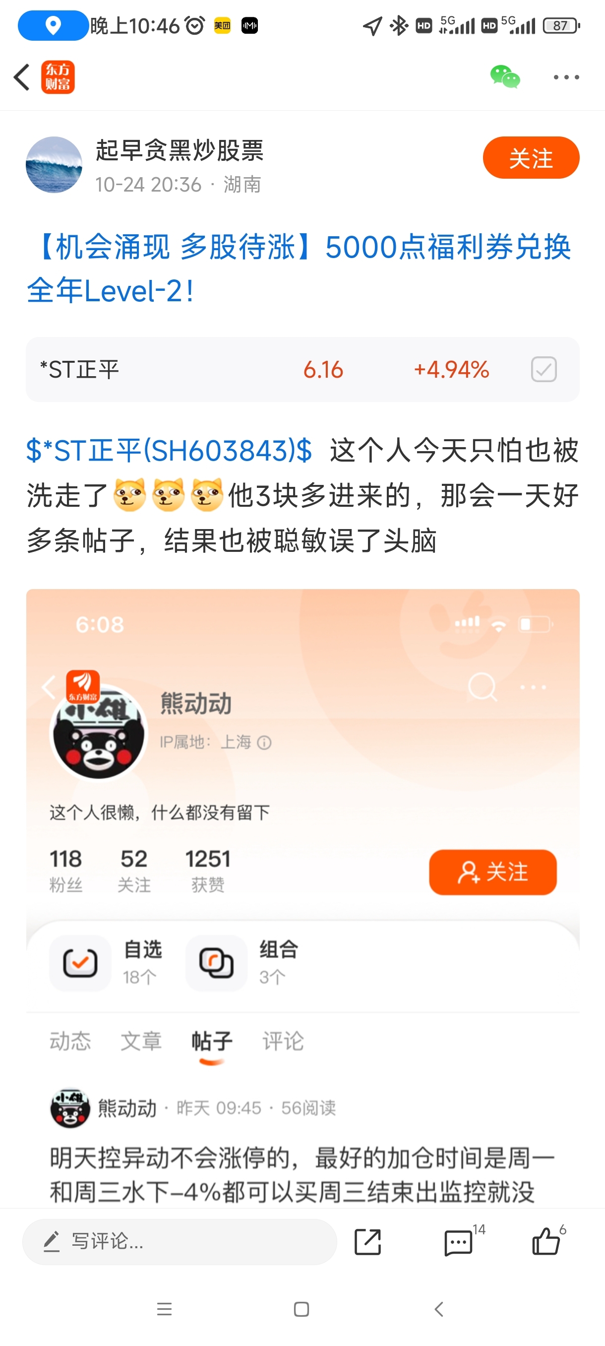 $*ST正平(SH603843)$ 我就不懂了,我预测错了还是咋了?我说今天控异动,官方没发控异动么?当然我确实没想到是晚上发控异动,你要当铁杆粉丝是你的事情。我都说了周一到周三我会加回来的。咋了现在这股吧只准加仓不准减仓?