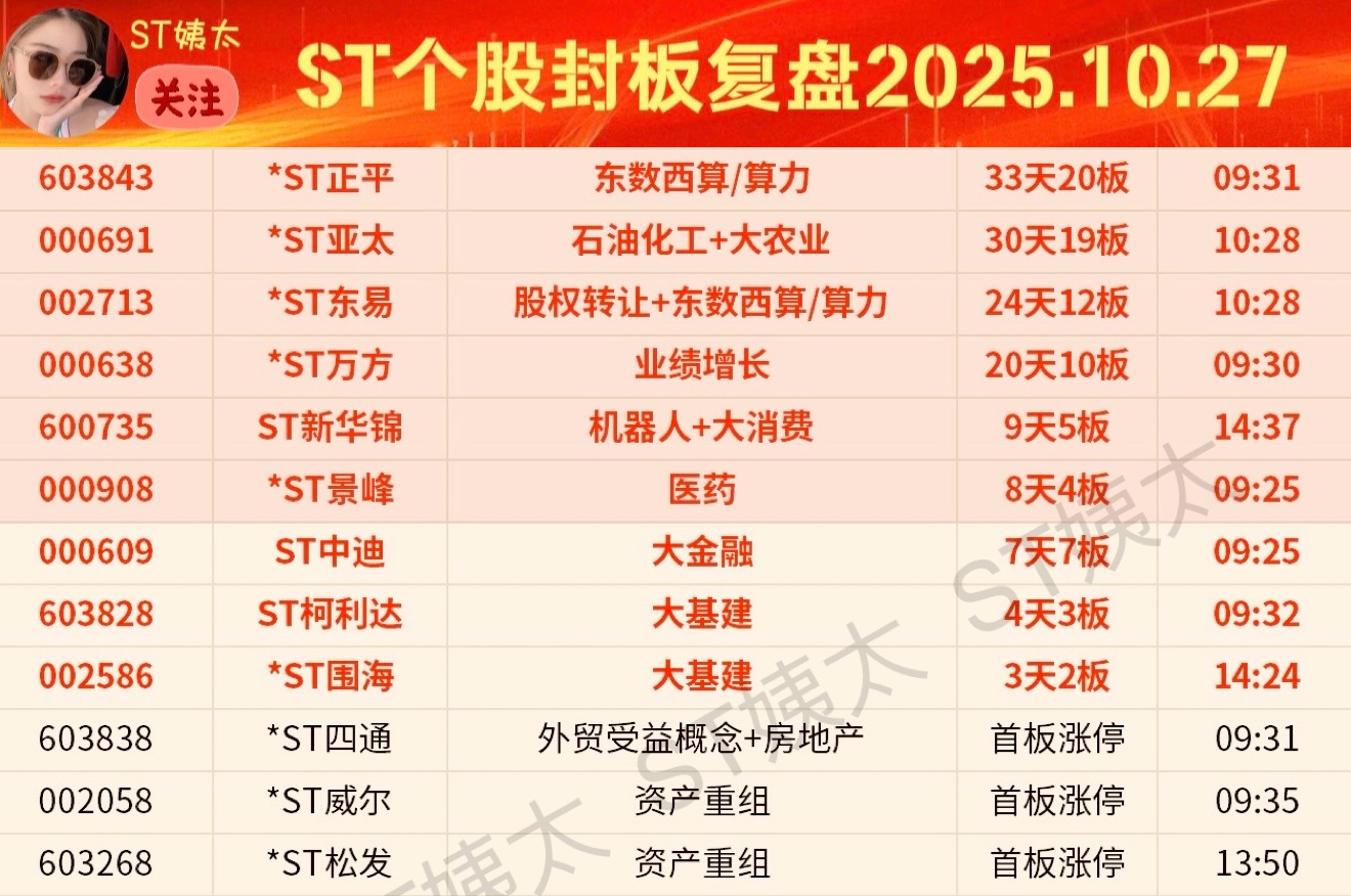 ST个股封板追踪:前三名